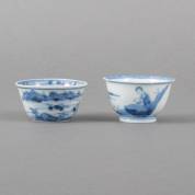 Twee Chinees porseleinen kommetjes met blauw-wit lange lijs- en landschapsdecor, 18e eeuw -chips langs de rand-, 4,5 × Ø 7 cm