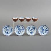 Vier Chinees porseleinen capucijner kommetjes en schoteltjes met blauw-wit decor, alle 18e eeuw -één kommetje met chip en één schoteltje met twee chips-, schoteltje Ø 11 cm