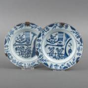 Twee Chinees porseleinen borden met diverse blauw-witte decors, beide 18e eeuw -beide met haarlijnen en randchips-, grootste Ø 23 cm