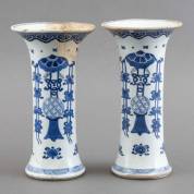 Paar Chinees porseleinen trompetvazen met blauw-wit decor van Boeddhistische symbolen, Kangxi -restauraties-, hoogte 24,5 cm