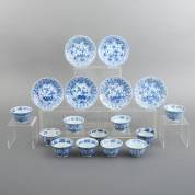 Acht Chinees porseleinen kommetjes en zes schoteltjes met blauw-wit floraal decor, Kangxi, Ø 14 cm, daarbij: drie kommetjes met gelijkende blauw-witte decors -haarlijnen en randdefecten, één schoteltje gelijmd-