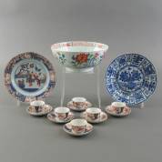 Divers Chinees en Japans porselein: famille rose kom, zes kommetjes en schoteltjes, en twee diverse borden, alle 18e eeuw -defecten-, kom 9,5 × 23,5 cm