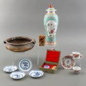 Divers Aziatica: bronzen wierookvat, porseleinen kastvaas, paar Japanse Imari kommetjes en schoteltjes, etc., wierookvat 9 × Ø 22 cm