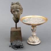 Verzilverde en vergulde bronzen tazza in 17e-eeuwse stijl, modern -oxidatie-, 16 × Ø 17,5 cm, metalen vrouwenhoofd op basement, klassieke stijl, modern, en bronzen kikker, Japan of China, 20e eeuw