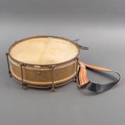 Ronde messing met leer bespannen trommel met draagband, eerste helft 20e eeuw, Ø 39 cm