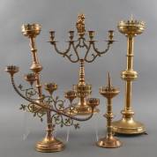 Drie messing penkandelaars -pen van één kandelaar ontbreekt-, en vierlichts messing kandelaar bekroond door leeuw met het wapenschild van Amsterdam, en vijflichts kandelaar die diagonaal afloopt, alle 20e eeuw, grootste penkandelaar 70 cm hoog