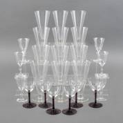 Zes conisch gevormde hoge glazen op ronde voet, zes glaasjes met heldere kelk op paarsglazen stam en voet, en zes likeurglaasjes, hoogte grootste 20 cm