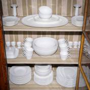 Porseleinen serviesgedeelte, model 'Filet Blue', uitvoering Villeroy & Boch, Luxemburg, bestaande uit: twaalf dinerborden Ø 26 cm, twaalf diepe borden Ø 23 cm, twaalf ontbijtborden Ø 21 cm, elf kop-en-schotels, zes eierdoppen, botervloot, twee ovale schalen, drie kleine ovale schaaltjes, twaalf ronde kommen in diverse groottes en twee kandelaars, hoogte kandelaars 13,5 cm