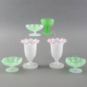 Twee witte opalineglazen plooivaasjes, drie groene bloemvormige schaaltjes op voet, en een bekertje, hoogste 15 cm