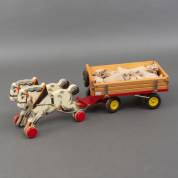 Houten kiepkar gevuld met jute zakken, getrokken door twee houten paarden, midden 20e eeuw, totale lengte 55 cm