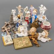 Verzameling religieuze beeldjes, voornamelijk engelen, verzilverde reliekhouder in de vorm van een kruis, rozenkrans in doosje, etc. -minieme defecten-, 17 cm