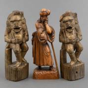 Gesneden notenhouten beeldje van staande man in 17e-eeuwse klederdracht, begin 20e eeuw, en een paar houten Bogorodskaya notenkrakers, Rusland, 19e eeuw, afmetingen beeldje 25 × 9,5 × 7 cm