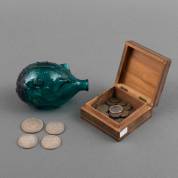 Vier zilveren munten: rijksdaalders 1933, 1959 en 1961, daarbij divers oud Nederlands muntgeld in houten kistje en groen glazen spaarvarken met wat muntgeld