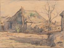 Edzard Willem Koning (1869-1954), boerderij nabij Nunspeet, krijt op papier, l.o. gesigneerd -hoekjes gevouwen, onderste helft met waterschade, punaisegaatjes in de hoeken-, 24,5 × 32,5 cm