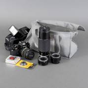 Analoge Nikon fotocamera, model FE2, met Micro-Nikkor 55 mm lens, zoomlens 80-200 mm, Nikon flitser en diverse attributen
