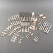 Verzilverd bestek met rocailledecor, bestaande uit: zes grote couverts met messen, zes kleine couverts met messen -één vork ontbreekt-, zes kleine lepels, drie kleine mesjes, zes theelepels, drie visvorkjes, vismesje, en twee dienlepels