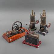 Vier blikken en metalen stoommachines, waaronder uitvoering Bing, eerste helft 20e eeuw -gebruikssporen en defecten-, grootste 32 × 14 × 12 cm