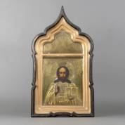 Russische icoon: Christus Pantocrator, met messing oklad en in baklijst met uivormige spits, 19e eeuw -vernis vergeeld-, maat geheel 68 × 38,5 × 8 cm