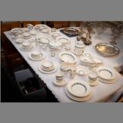 Creamware serviesgedeelte, model Edme, decor Stratford, uitvoering Wedgwood, bestaande uit: vier dinerborden Ø 26 cm, tien diepe borden Ø 23 cm, acht dessertborden Ø 23 cm, één kleiner bord Ø 20,5 cm, tien taartbordjes Ø 16 cm, tien broodbordjes Ø 13 cm, zes soepkommen op schotels, theepot, roomstel, waterkan, vier grote theekop-en-schotels, zes kleine theekop-en-schotels, negen smallere koffiekop-en-schotels, drie eierdopjes en divers dienservies