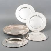 Vier verzilverde onderborden, uitvoering Koninklijke Begeer, Ø 29 cm, en rond verchroomd cabaret met bloemdecor -enigszins sleets- Ø 35,5 cm
