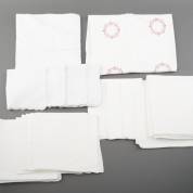 Katoenen ajourgeborduurd tafelkleed met geschulpte rand en twaalf bijbehorende servetten, 29 damast servetten en damast tafelkleed met borduurwerk -kleine vlekjes-, ajourkleed 260 × 170 cm