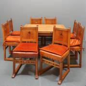 Eiken tafel met twee uitschuifbladen, het onderstel met driepas, verbonden door regel, met acht bijbehorende stoelen, in de rug eenzelfde driepas, de zitting van schapenleer, op slofpoten, voorzien van velours kussentjes -gebruikssporen-, tafel 75 × 110 × 81 cm, uitgeschoven 75 × 190 × 81 cm
