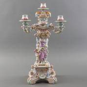 Porseleinen vierlichts kandelaar, de stam in de vorm van de drie gratiën, de voet met vier sfinxen, gemerkt, modern -restauratie aan de arm van een sfinx en in een flank van een gratie, kleine defecten aan bloemen-, hoogte 62 cm