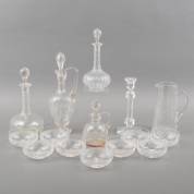 Vier kristallen karaffen, waterkan met negen vingerkommen, begin 20e eeuw en kandelaar, modern, -één karaf met aanslag-, hoogte waterkan 22 cm