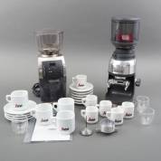 Twee koffiemolens / bonenmalers: Baratza Vario W+ en Espressions of Australia -niet getest-, daarbij: diverse koffiekopjes