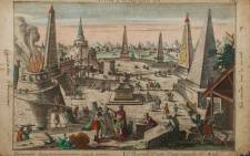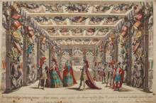 Opticaprent: 'Die ruhenden Waffen, ein Zeichen des Friedens', Augsburg, eerste helft 18de eeuw, oudgekleurd. Naar een ontwerp van Lodovico Burnacini (1636-1707) 'architect, theaterpodium- en kostuumontwerper, een van de belangrijkste theateringenieurs in het barokke Europa'