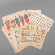 Circa 20 gekleurde centsprenten: gevarieerde onderwerpen (zouaven 4 prenten, St. Nicolaas (2), alfabet (2), Van Speyk, Luilekkerland, enz.) -zeer bros en dun papier-, 40 × 33 cm
