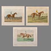 Drie litho's: paarden en jockeys, tweemaal winnaars van de Epsom Derby, respectievelijk in 1870 en 1873, en eenmaal de winnaar van de Derby de Chantilly in 1865 -roestvlekjes en kleine defecten in de marges-, 53,5 × 66 cm