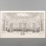 Daniël Marot (1661/1663-1752), 'De Groote Gehoor-zaal in Den Haag, in den welken de heeren Staaten Generaal der Vereenigde Nederlanden de gesandten ontfangen en hunnen vergaaderingen houden.', kopergravure, vermoedelijk latere druk -enkele vlekjes-, 43 × 72 cm