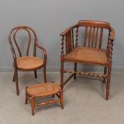 Armstoel, kinderstoel, en voetenbankje, alle met pitrietbespanning, eind 19e/begin 20e eeuw -kleine defectjes in bespanning-