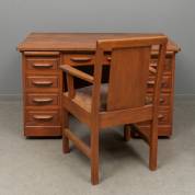 Eiken bureau met diverse lades, tweede kwart 20e eeuw, 72 × 127 × 74 cm -gebruikssporen-, daarbij: eiken armstoel