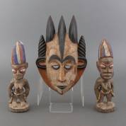Paar polychroom beschilderde Afrikaans houten vrouwenbeelden, Yoruba, Nigeria, en Afrikaans houten masker met wit gezicht, Punu, Gabon, 33 × 22 cm
