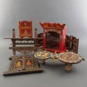 Roodgeschilderd houten huisaltaar, zwartgeschilderd paneel met deurtjes, een zwart- en een roodgeschilderd tafelscherm, polychroom geschilderd kapstokje en tafeltje, India, 2e helft 20e eeuw -gebruikssporen-, hoogte huisaltaar 44 cm