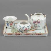 Divers Chinees porselein met famille rose figurendecors: dienblaadje -randchip-, theepotje -geen deksel, en stapelbaar warm wijnkommetje -randchip-