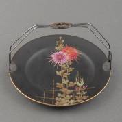 Japans porseleinen bord, zwart met bloemdecor en dubbel BWZG hengsel met bamboedecor, circa 1920, 13 × Ø 18,5 cm, in cassette
