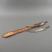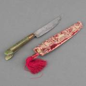 Turks mes in de vorm van een yatagan, het groene benen heft ingelegd met diverse metalen, Balkan, 19e eeuw, met lederen foedraal, bekleed met rood velours en geborduurde florale motieven in zilverdraad -beetje speling tussen de onderdelen, enkele scheurtjes in been-, lengte 30 cm