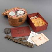 Drie stuks Aziatica: theeset in draagmand, mahjongspel, en Chinese metalen ceintuur gemaakt voor de Zuidoost-Aziatische markt -riem en mahjongspel defect-