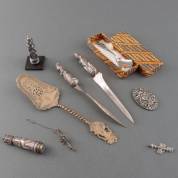 Negen stuks BWZG Djokja: twee siermessen, twee heften, een suikerschep in een doosje, een gesp, twee dasspelden, en een taartschep, Indonesië, brutogewicht 354 gram
