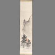 Japanse rolschildering: bomen bij berg, rechts met stempels en karakters, schildering 120 × 28, rol 200 cm lang