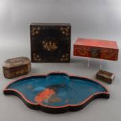 Vijf stuks lakwerk, waaronder: theedoosje, dienblad -gelijmd- en drie doosjes -slijtages-