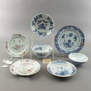 Vijf diverse Chinees porseleinen schoteltjes waarvan twee met blauw-witte decors: vlinders boven bloem -haarlijn-, en bloemen in cartouches -gekramd-, beide Kangxi, grootste Ø 16 cm, en drie met Imari bloemdecors, Qianlong -haarlijnen- Ø 11,7 cm