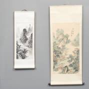 Twee Chinese scrolls: rotsachtig landschap met pagodes en drie figuren -beschadiging-, en rotsachtig landschap met waterval, beide gesigneerd, grootste 134 × 54 cm