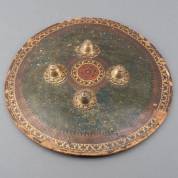 Gehard lederen polychroom beschilderd Dàhl schild met vier messing noppen, aan de achterzijde twee leren banden en kussen voor de hand, Indo-Perzisch, 19e eeuw -intensief gebruikt-, Ø 42,5 cm