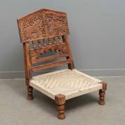 Laag teakhouten stoeltje met gesneden inklapbare rugleuning en gevlochten zitting, India