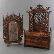 Chinees houten huisaltaar met drie laatjes, de gesneden achterwand met decor van een figuur op mythisch wezen op golven -gebruikssporen-, en houten huisaltaar met gouden accenten en centraal een afbeelding van een heilige -afbeelding en omlijsting beschadigd-, hoogte grootste 70 cm