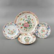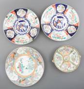 Chinees porseleinen schotel en drie borden, waaronder een Japans exemplaar, alle met polychrome decors, 18e en 19e eeuw -defecten-, grootste Ø 34 cm